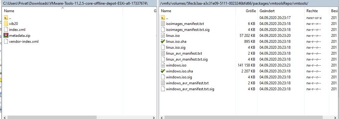Und selbstverstaendlich sind in dem verlinkten Download die .iso und .flp drin wie erwaehnt. vib20 enthaelt tools-light, in tools-light gibt es u.a. VMware_locker_tools-light_11.2.5.17337674-17339593.vib, in VMware_locker_tools-light_11.2.5.17337674-17339593.vib gibt es tools-light.tar, in tools-light.tar gibt es vmtoolsRepo, und in vmtoolsRepo schliesslich liegen "floppies" und "vmtools".