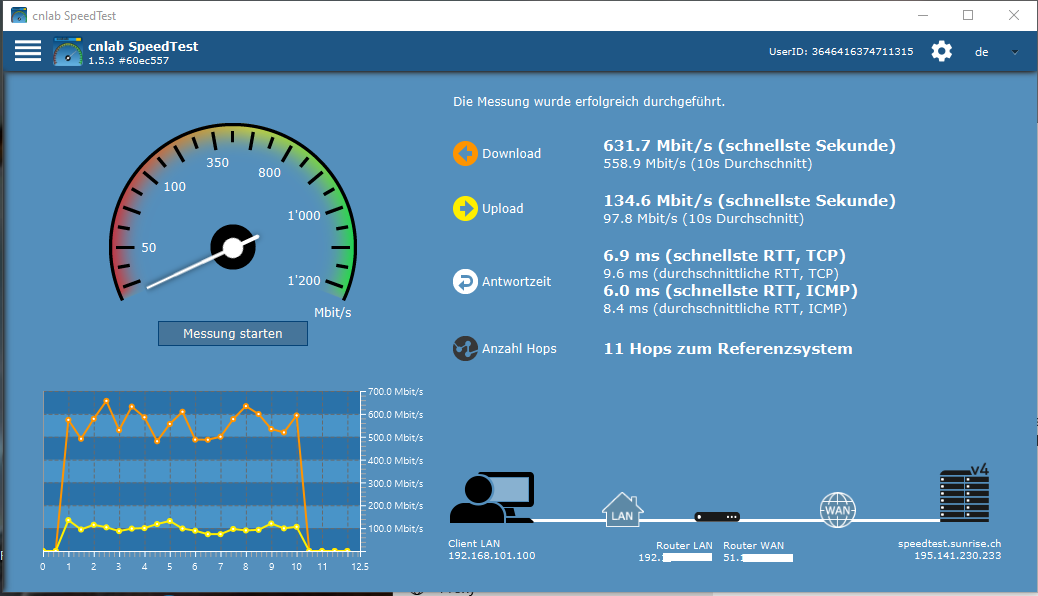 Nein, gar nicht. Aber ich habe auf dem Desktop mal die Testapp aktualisiert, und mittlerweile auch so um die 250-270 Mbit/s im Upload. Das ist schon viel besser. Also wie oben abgebildet auf der DMZ.
