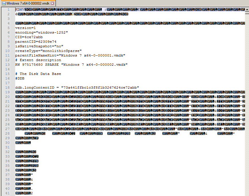 Naechste Merkwuerdigkeit ist, dass Dein abgebildeter Dateianfang von "Windows 7 x64-0-000002.vmdk" anzeigt, dass die -000002.vmdk auf die -000001.vmdk verweist, die Deine .vmx aber als Ende der Snapshotkette vermerkt.