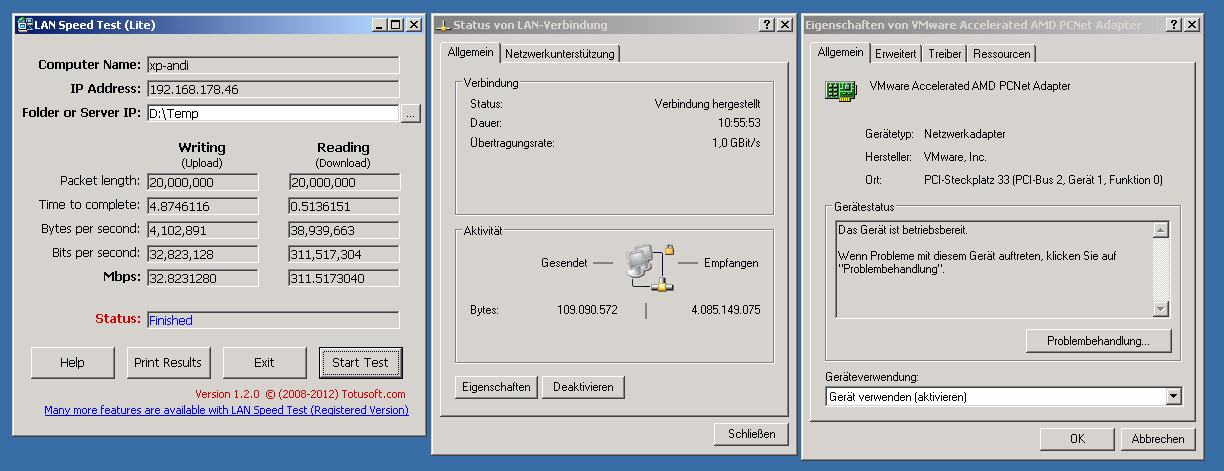 Die virtuelle Standard-Netzwerkkarte unter dem virtuellen XP ist eine uralte 10MBit-Karte, die dann nominal auch mit 10 MBit läuft. Ich habe das mal ausgemessen: ca. 40 MB in 5 Sekunden beim Lesen und Schreiben.