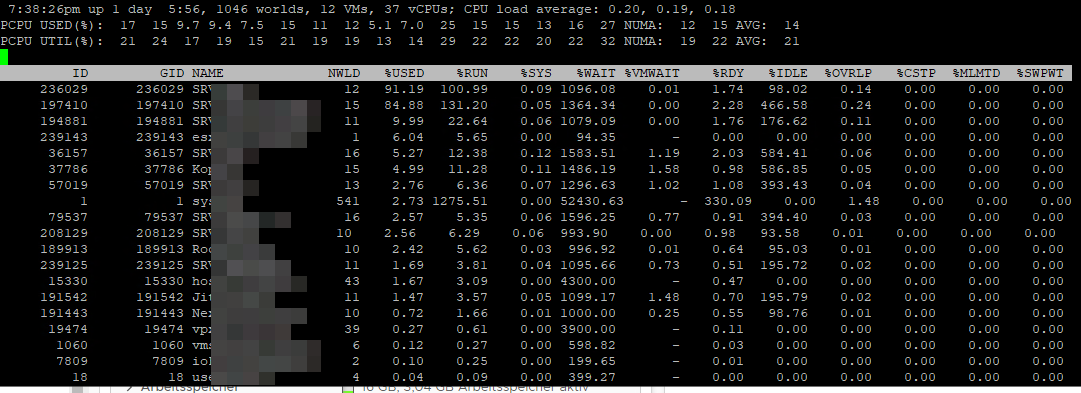 Bzgl. CPU Auslastung fällt auf, dass eine VM sowohl bei %USED als auch %RUN das System sogar heute (Sonntag, es ist nichts los) über 100% beansprucht.