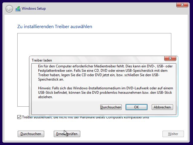 Der Dialog mit dem fehlenden Treiber wird vom Windows PE eigentlich nur dann angezeigt, wenn es mit seinem Basis-Treibersatz keine Festplatte findet.
