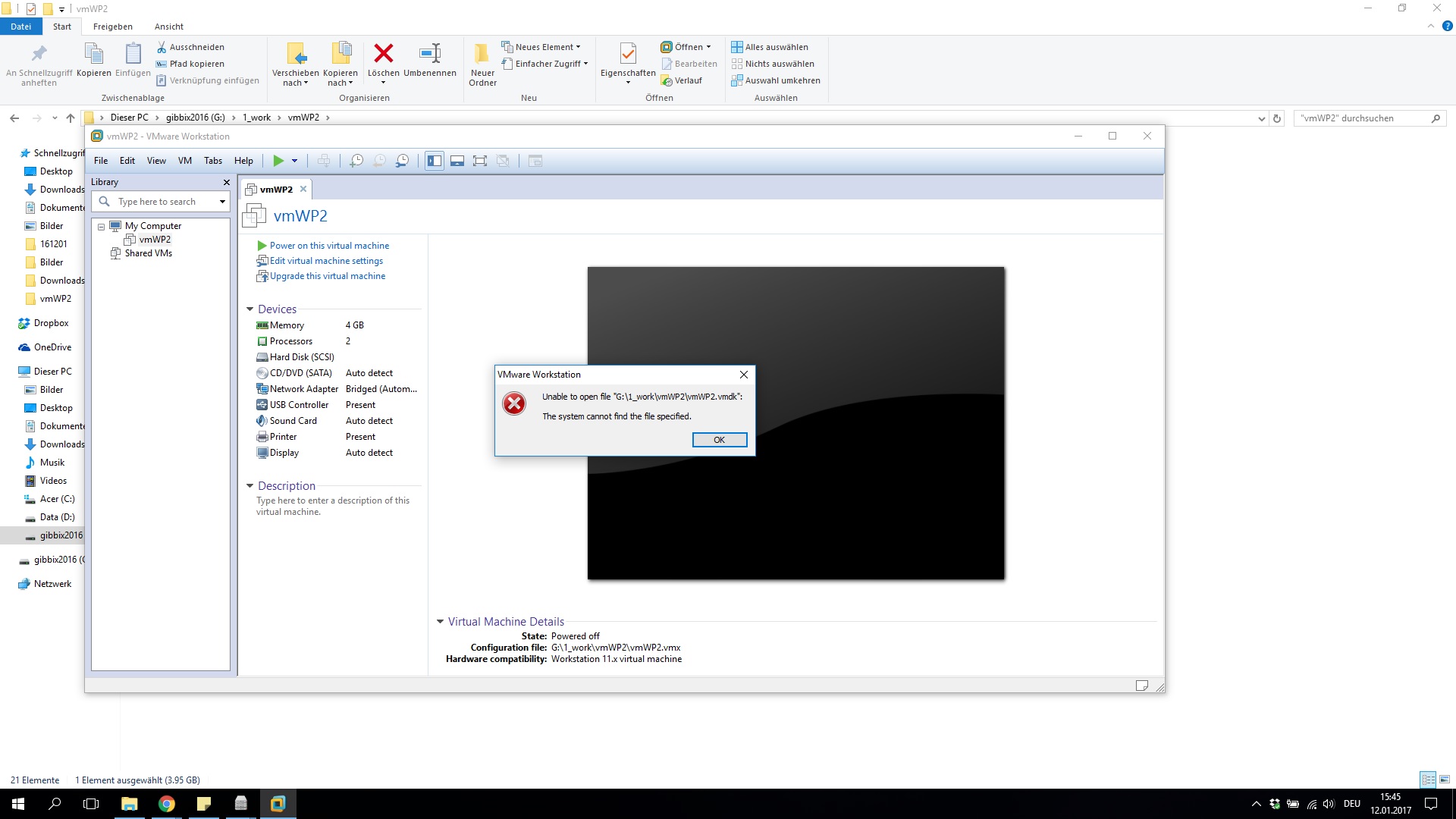 Jedoch kommt nun die Meldung :Unable to open file "G:\1_work\vmWP2\vmWP2.vmdk": The system cannot find the file specified. ( entsprechender Ordner auch als Screenshot hinzugefügt)
