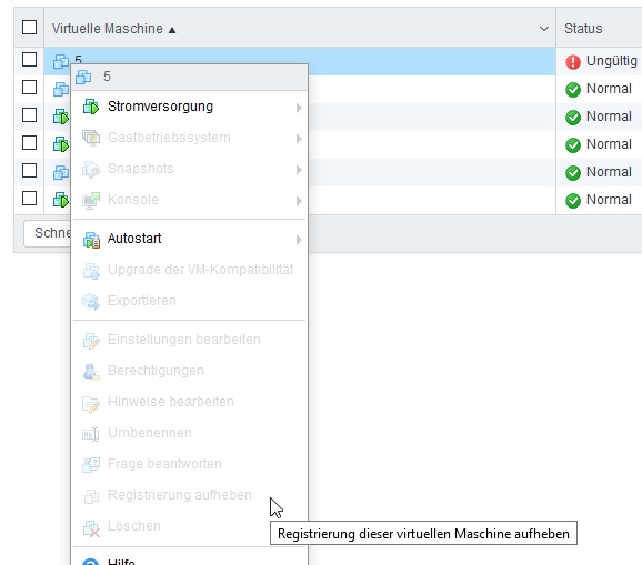 ich habe versehentlich bei einer meiner VM´s die Festplatten-Dateien gelöscht und jetzt hängt die Maschine als "unbekannt" in der Auflistung