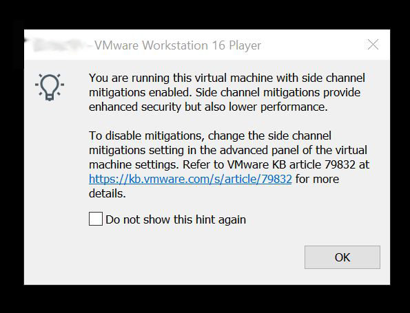 Beim Start der virt. Maschine kommt seit heute "...To disable mitigations, change the side channel mitigations setting in the advanced panel of the virtual machine settings...."