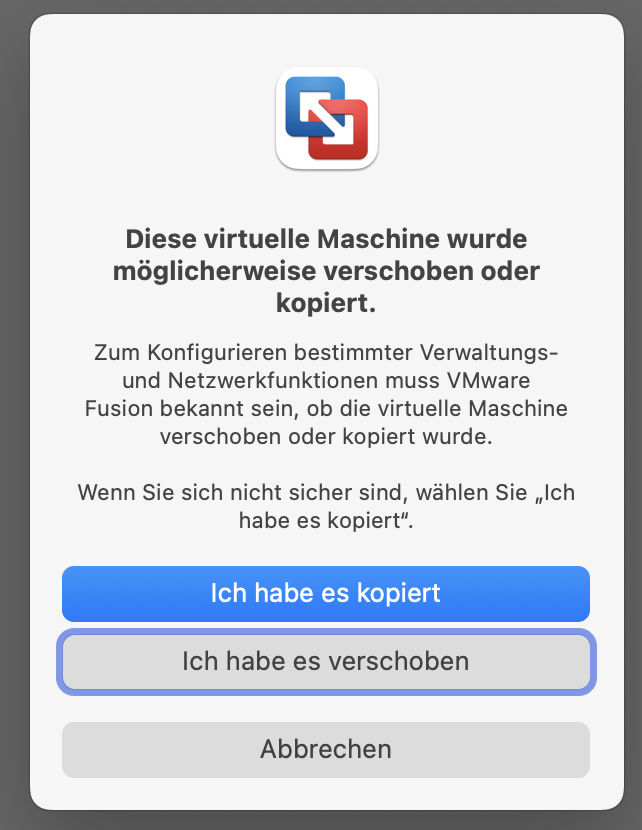 Vor einigen Wochen trat nach Update auf MacOS 15.1.1 (42B91) schon das Problem auf, das VMWare Fusion der Meinung war, dass ich meine virtuelle Maschinen verschoben oder kopiert hätte. Beides habe ich jedoch nicht gemacht. Seitdem habe ich nach dem Start immer "verschoben" angegeben.
