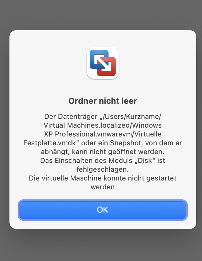 Fehlermeldung: Datei nicht gefunden: /Users/papa99/Documents/Virtuelle Maschinen/Windows 8 Quickbooks.vmwarevm/Windows 8 Quickbooks.vmdk